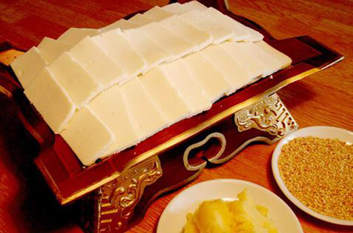 奶豆腐:是蒙古族最常見(jiàn)的奶食品之一。制做方法是將酸奶子放在鍋中經(jīng)慢火熬煮,放入布袋擠壓而成。奶豆腐有酸味、甜味不等,依主人的口味采用不同方法而制成。