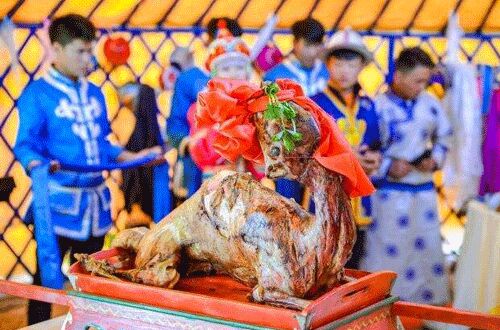 蒙語稱“烤全羊”為“昭木”、“好尼、西日那”,這是蒙餐宴席中一道最講究的名菜,色、香、味、形俱佳,有濃烈的民族風味和地方風味,是蒙古民族中的餐中之尊,多在隆重宴會或祭典供獻時用?!哆_斡爾蒙古考》中也寫到,“餐品之尊,未有過于烏查(即烤全羊)者?!边@種風俗,蒙古族至今還保持著。烤全羊是在過去蒙古族飲食“火烤羊肉”的基礎上,與“烤鴨”的方法結合而成的??救虻闹谱鲞^程是:選二年左右的肥綿羯羊一只,用水燙去羊毛,開內臟,用調料腌制腹腔內,外面刷一層糖色和香油,風干后用鐵鏈吊起放入燒好的烤爐內。大約四、五個小時后即可出爐食用?! 】救蛏舷靡淮竽颈P,使羊平臥盤中,羊脖上系一紅綢帶以示吉利和隆重。端入餐室讓客人觀看一下后,回到廚房內用刀切割。先上羊的脆皮,而后上切好的肉塊,最后連骨頭一塊上,上桌時,隨帶合頁餅、蔥段、黃醬、醋、蒜末等,還配幾盤牛羊肉做的熱菜,以及牛羊內臟做的冷盤和奶食品。據文獻記載,成吉思汗曾設過全羊宴。忽必烈登基時,也設全羊宴祭神祇、待賓客。到了清代全羊更加盛行,現在成為內蒙古各盟、旗縣接待貴賓的馳名中外的名貴菜肴。