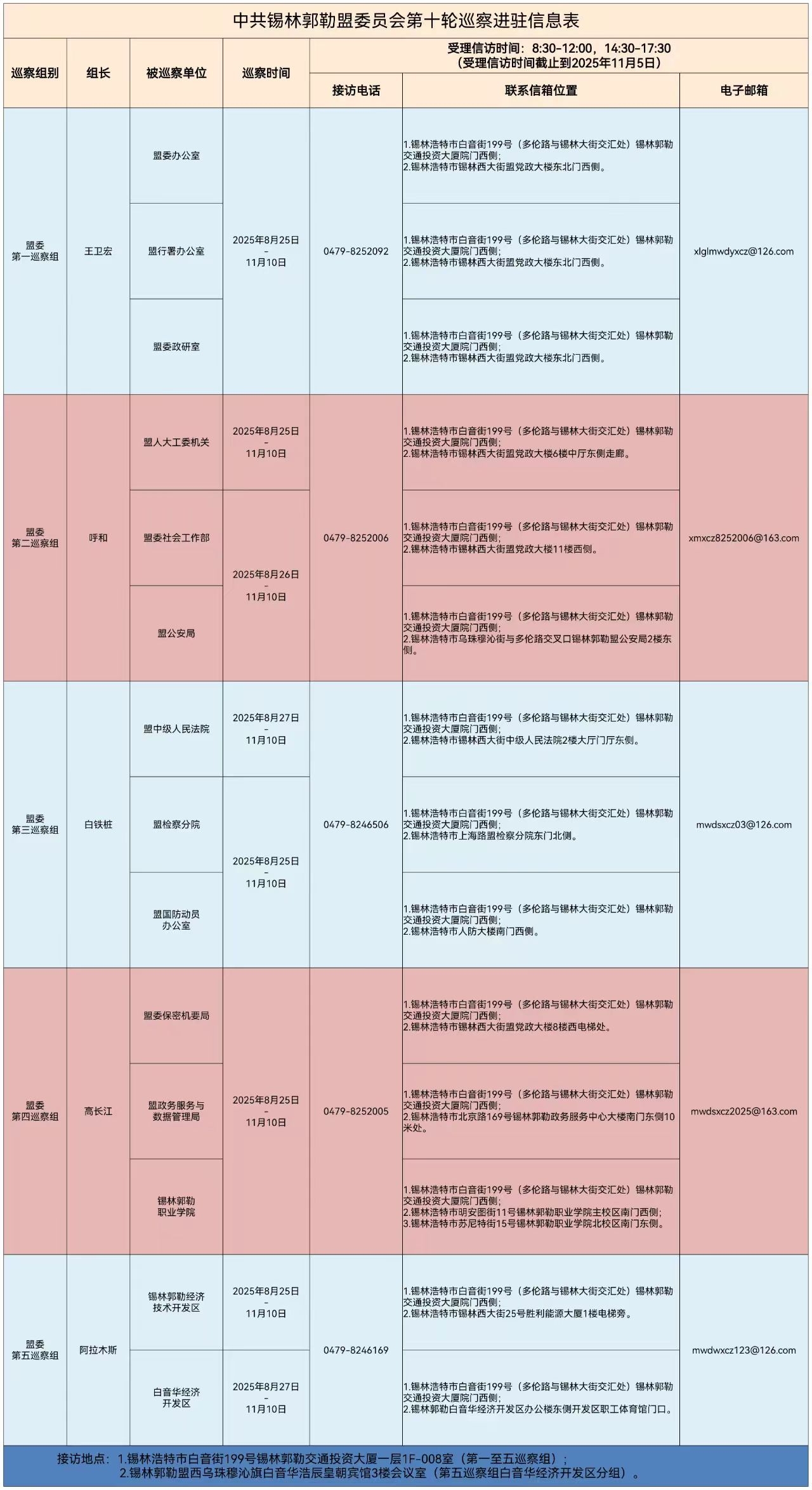 各巡察組均設立專門值班電話和聯系信箱,主要受理反映被巡察黨組織領導班子及其成員、下一級黨組織主要負責人和重要崗位領導干部問題的來信來電來訪,重點是關于違反政治紀律、組織紀律、廉潔紀律、群眾紀律、工作紀律和生活紀律以及巡察整改等方面問題反映。受理信訪時間截止到2025年11月5日。