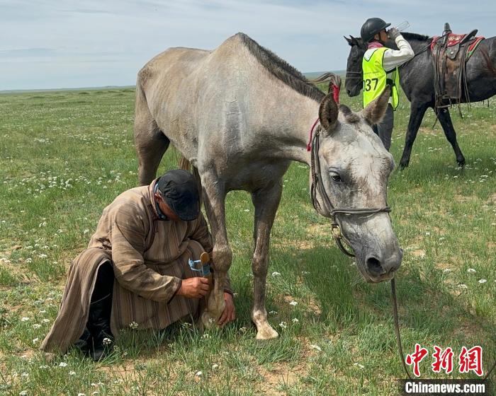 圖為參賽的蒙古馬骨折,牧民把腰帶撕成條來固定傷處。奧藍 攝