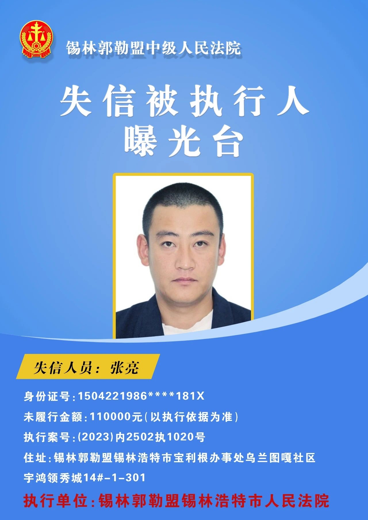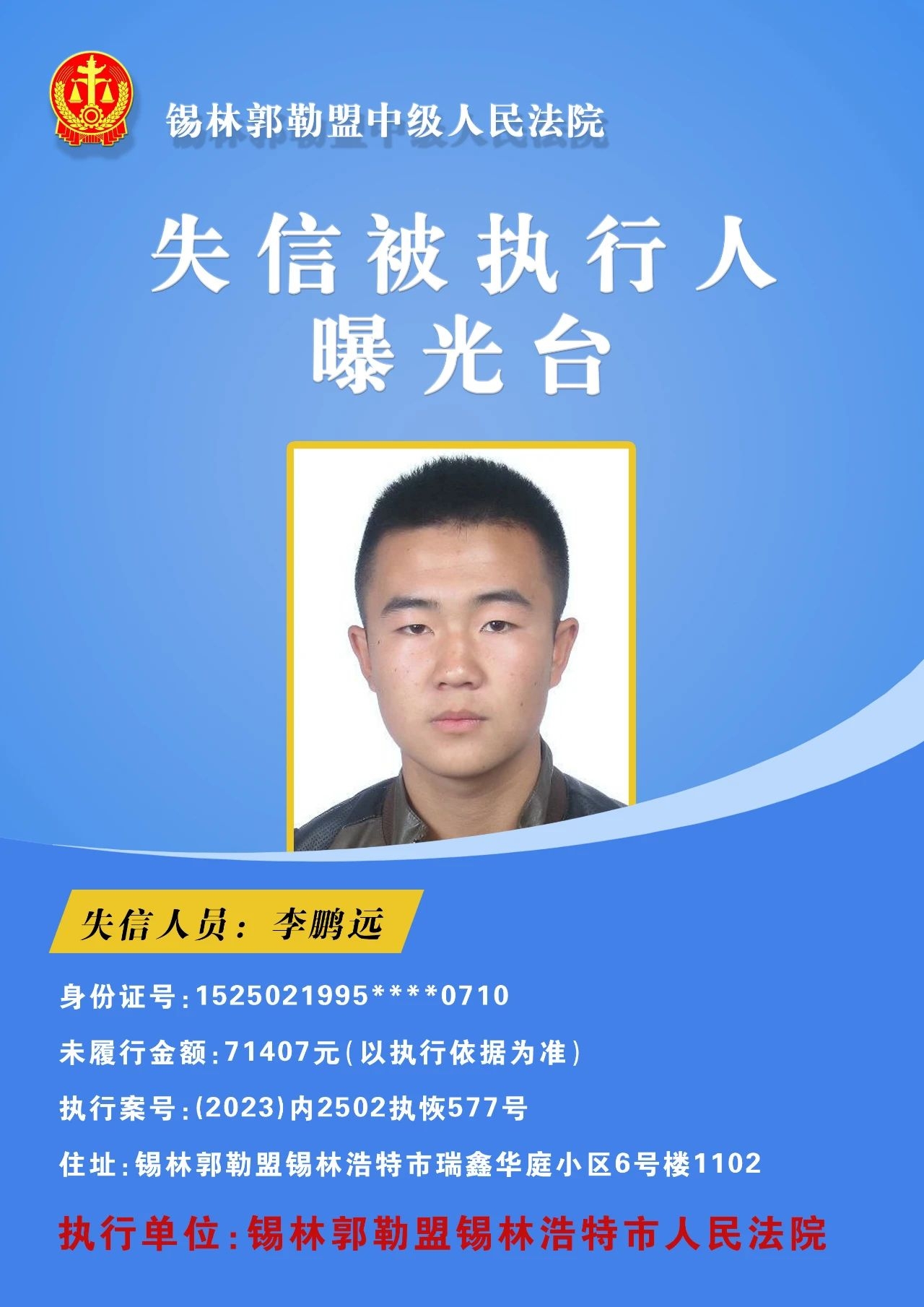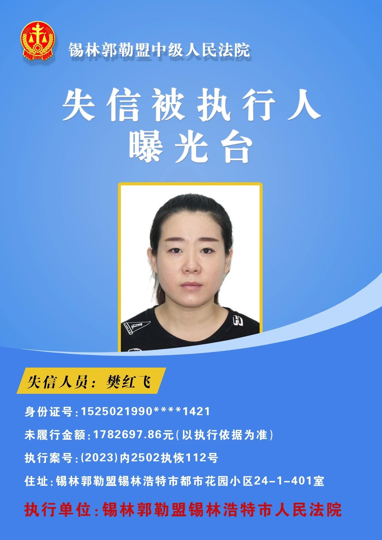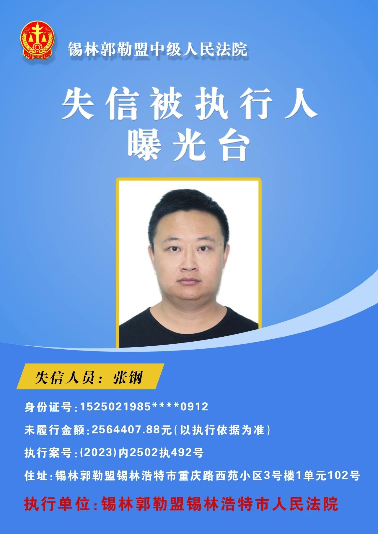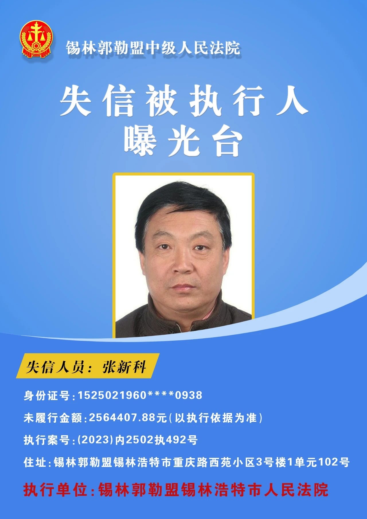 為切實保障申請執行人的合法權益,促使被執行人自覺履行生效法律文書確定的義務,推進社會信用體系建設,維護司法權威,根據 《最高人民法院關于公布失信被執行人名單信息的若干規定》的相關規定,經依法審查,現錫林郭勒盟中級人民法院將下列失信被執行人名單予以公布,希望社會各界予以監督,如有發現失信被執行人線索,請及時舉報。