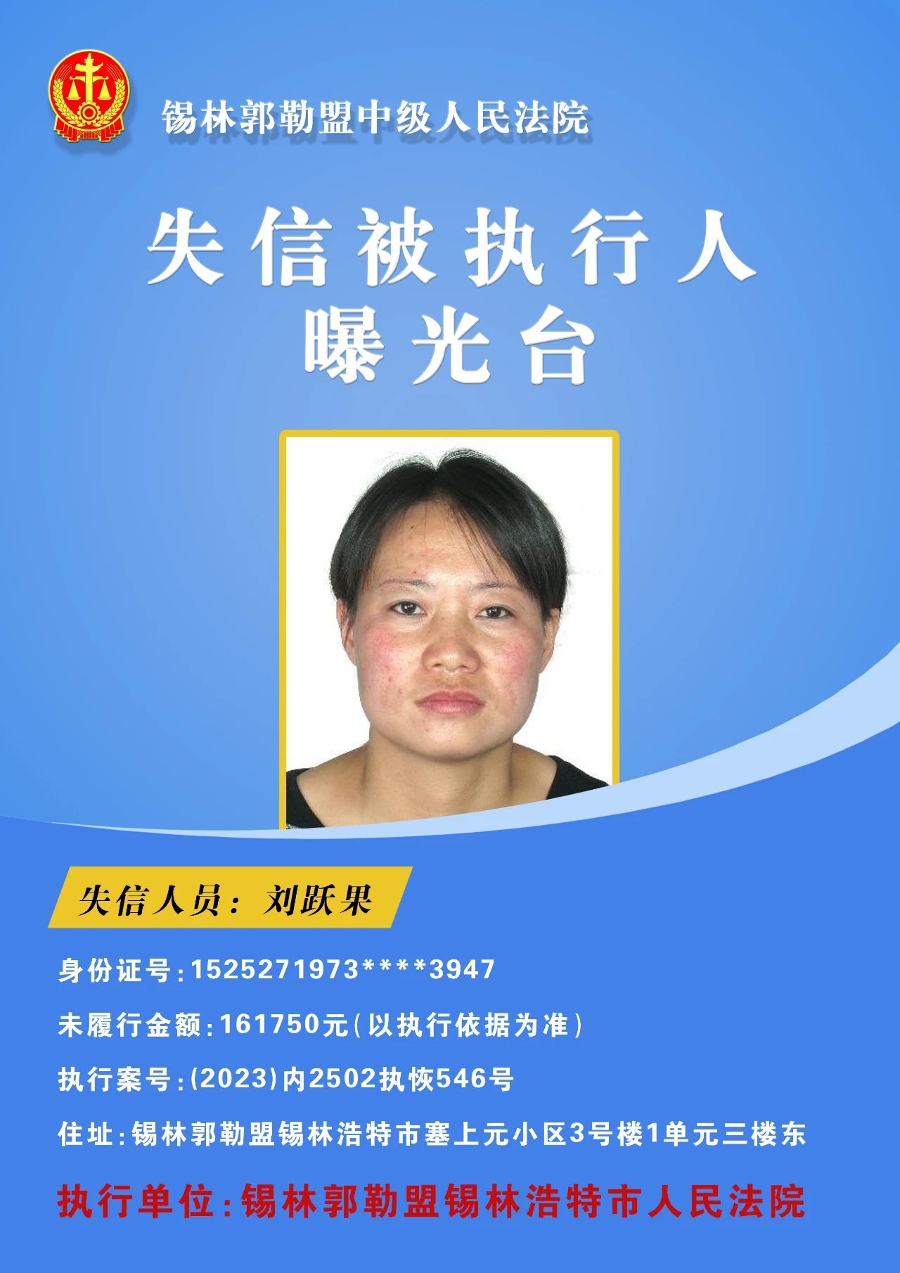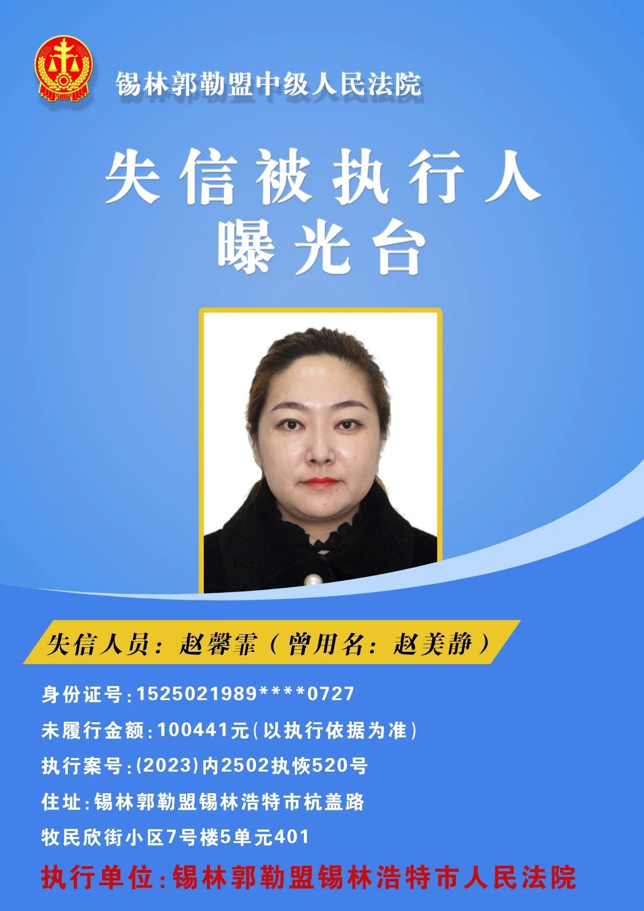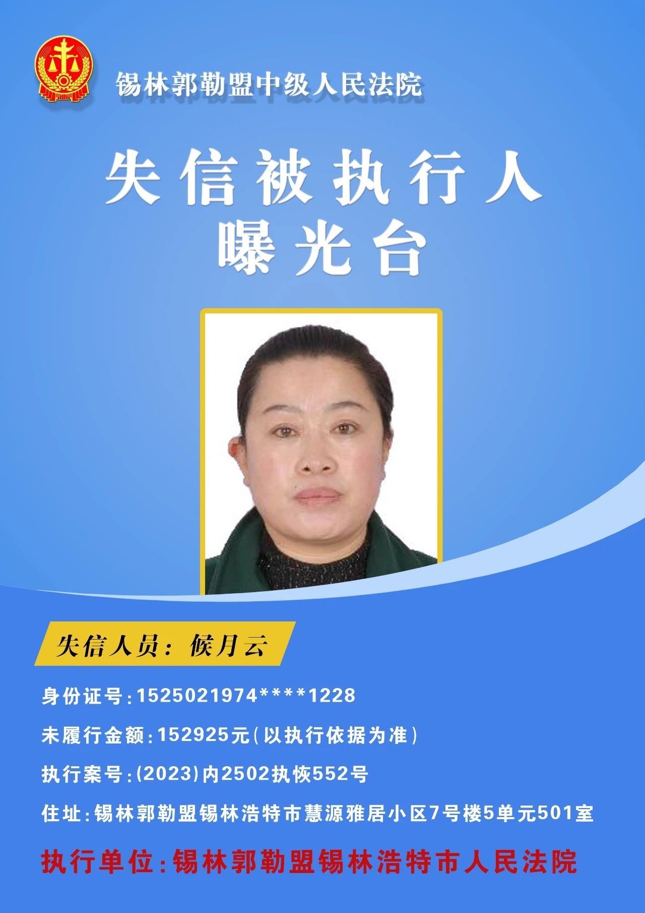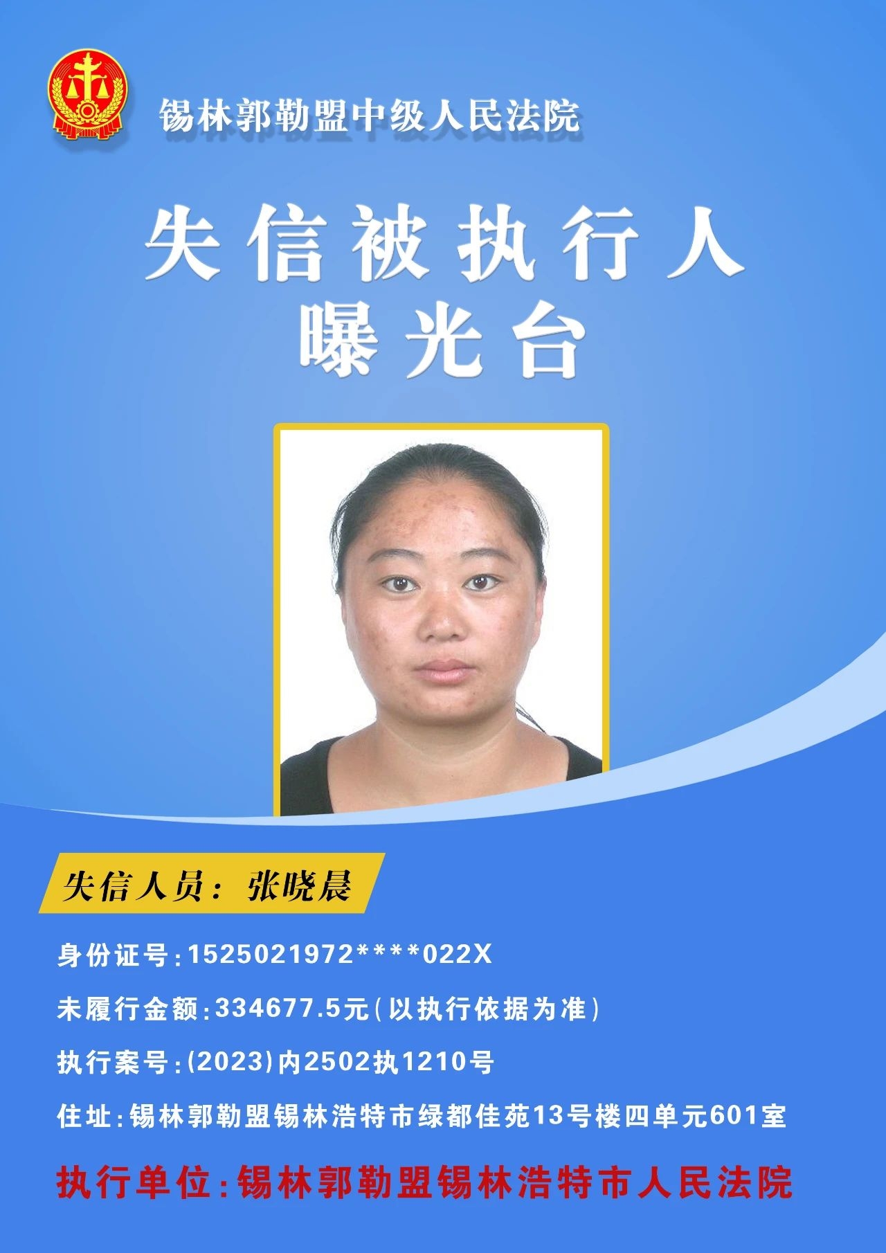 為切實保障申請執行人的合法權益,促使被執行人自覺履行生效法律文書確定的義務,推進社會信用體系建設,維護司法權威,根據 《最高人民法院關于公布失信被執行人名單信息的若干規定》的相關規定,經依法審查,現錫林郭勒盟中級人民法院將下列失信被執行人名單予以公布,希望社會各界予以監督,如有發現失信被執行人線索,請及時舉報。