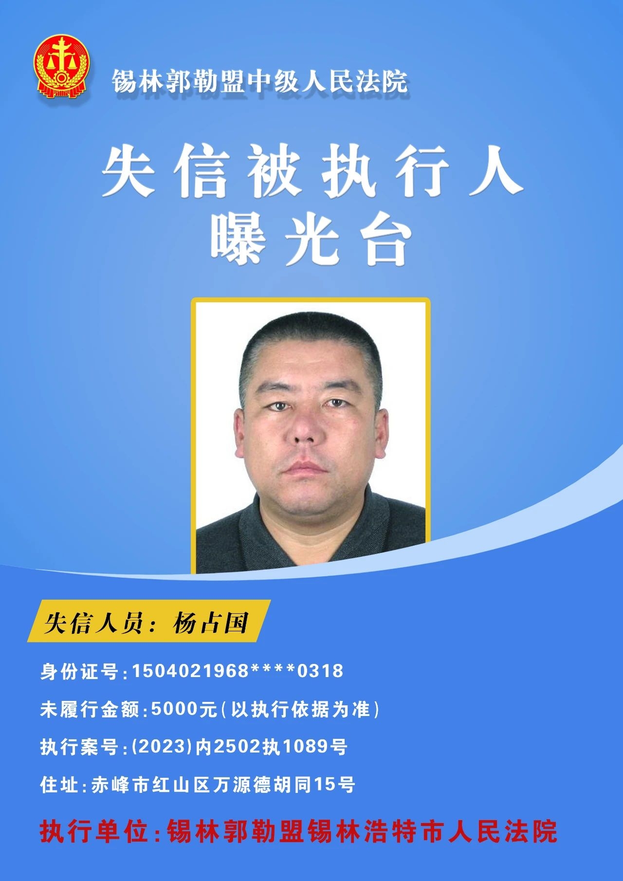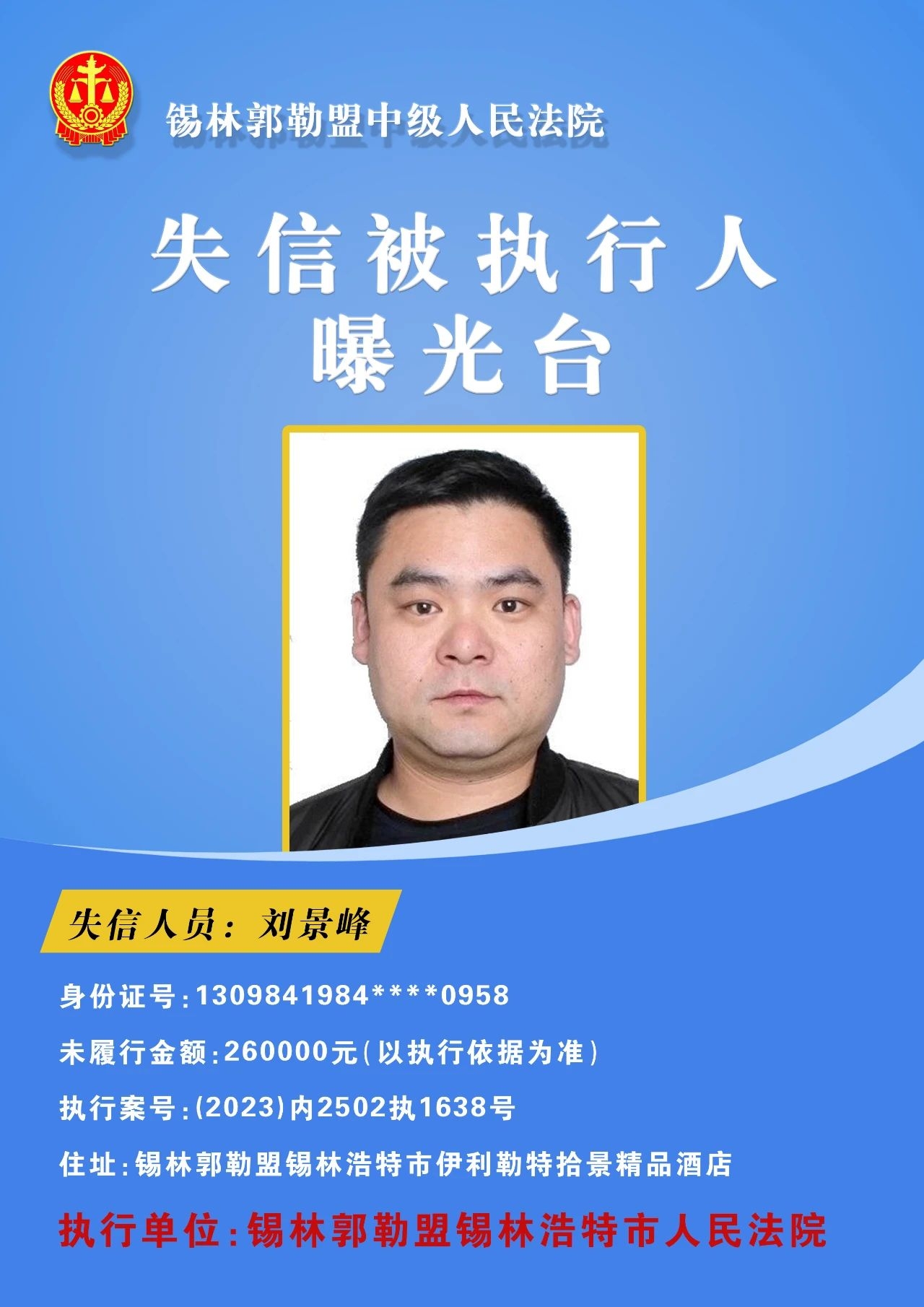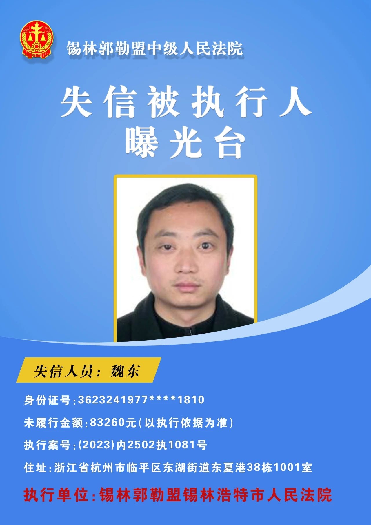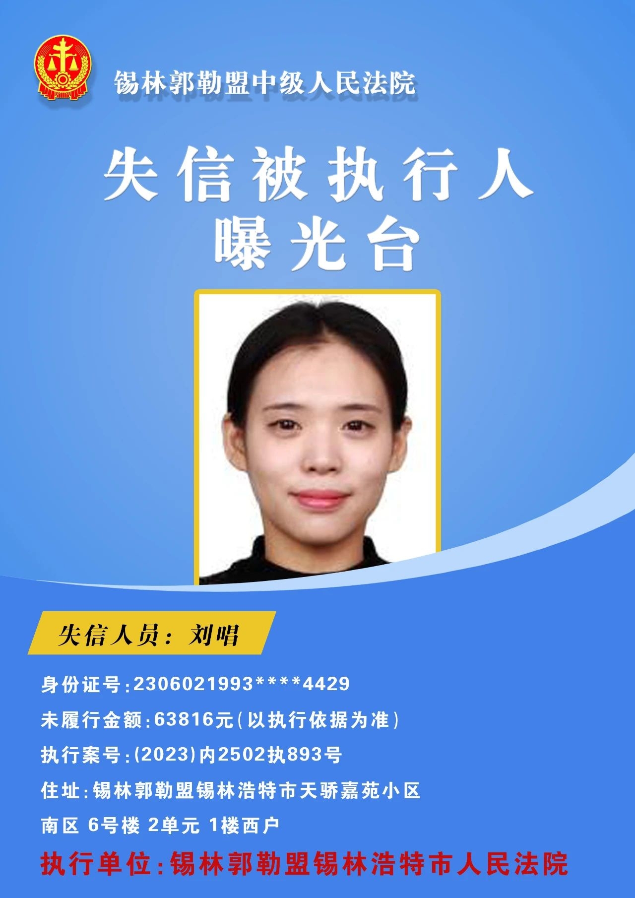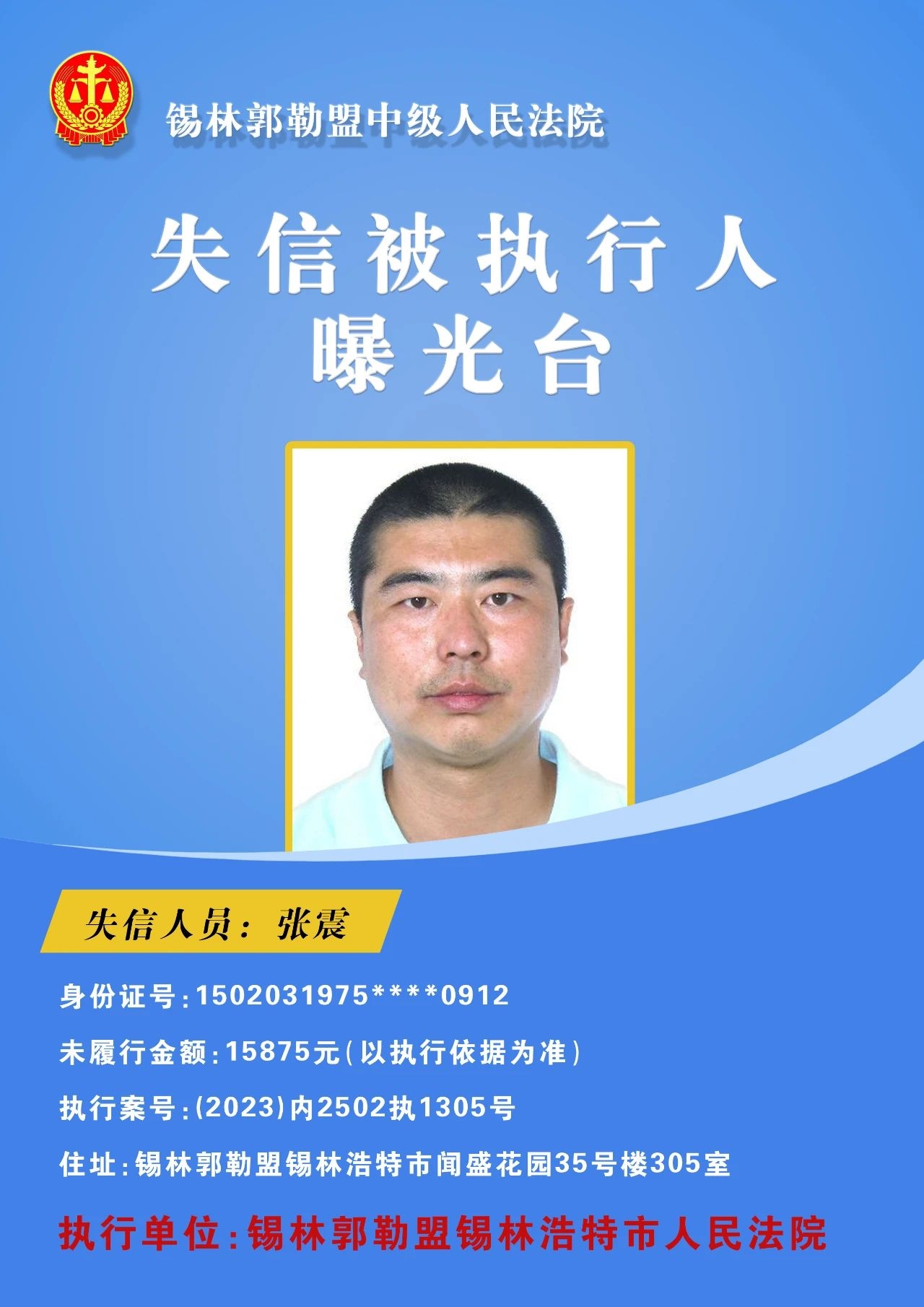 為切實保障申請執行人的合法權益,促使被執行人自覺履行生效法律文書確定的義務,推進社會信用體系建設,維護司法權威,根據 《最高人民法院關于公布失信被執行人名單信息的若干規定》的相關規定,經依法審查,現錫林郭勒盟中級人民法院將下列失信被執行人名單予以公布,希望社會各界予以監督,如有發現失信被執行人線索,請及時舉報。