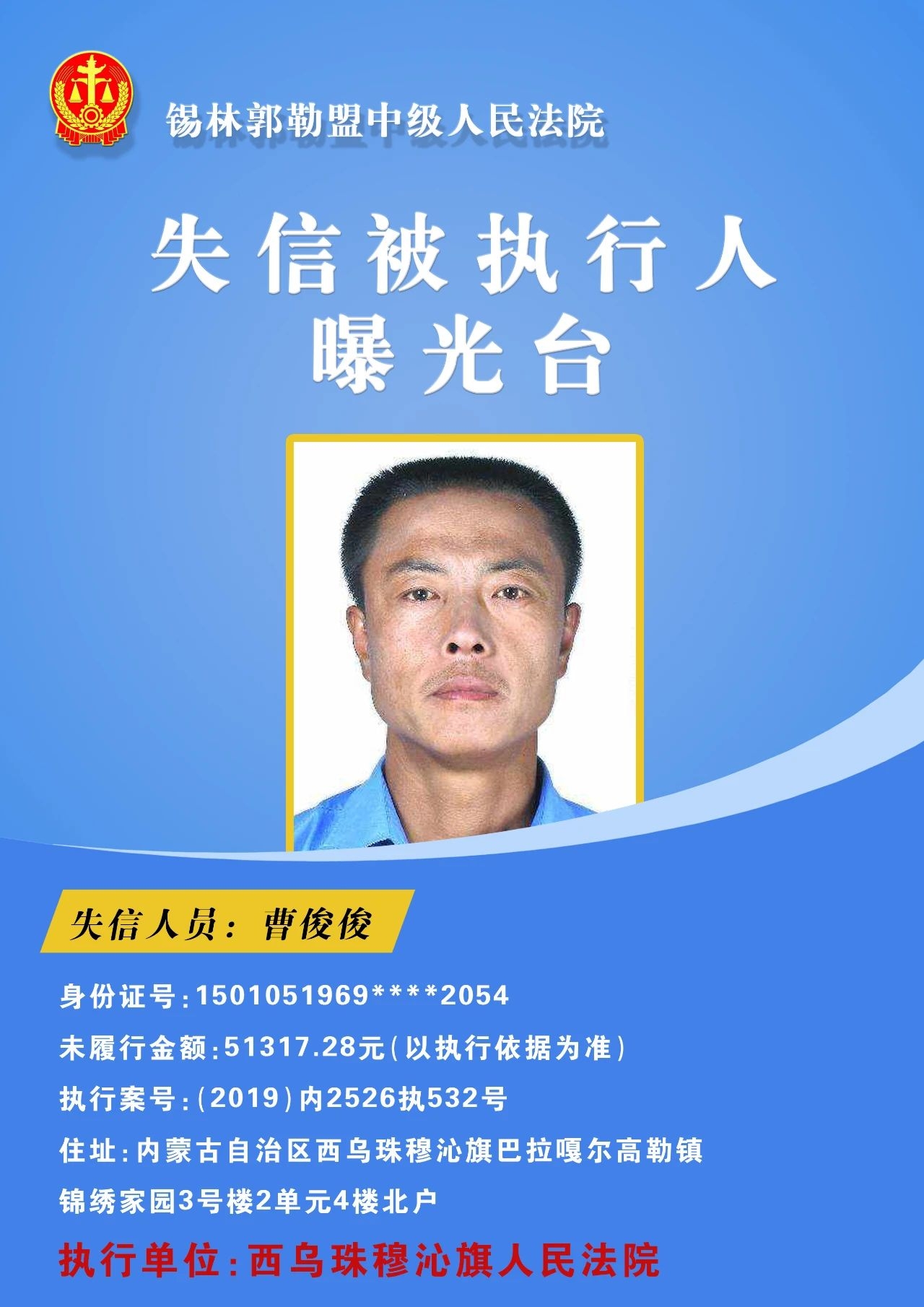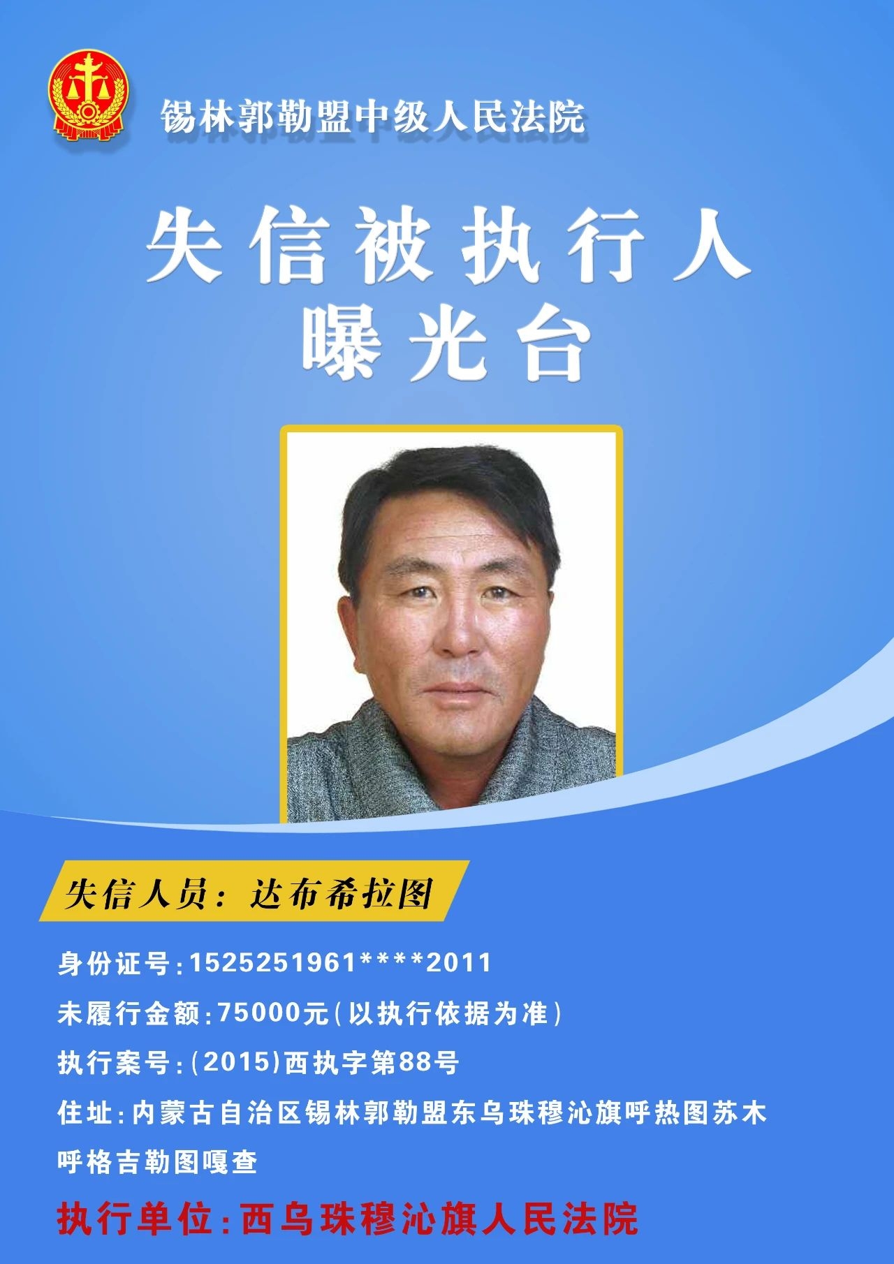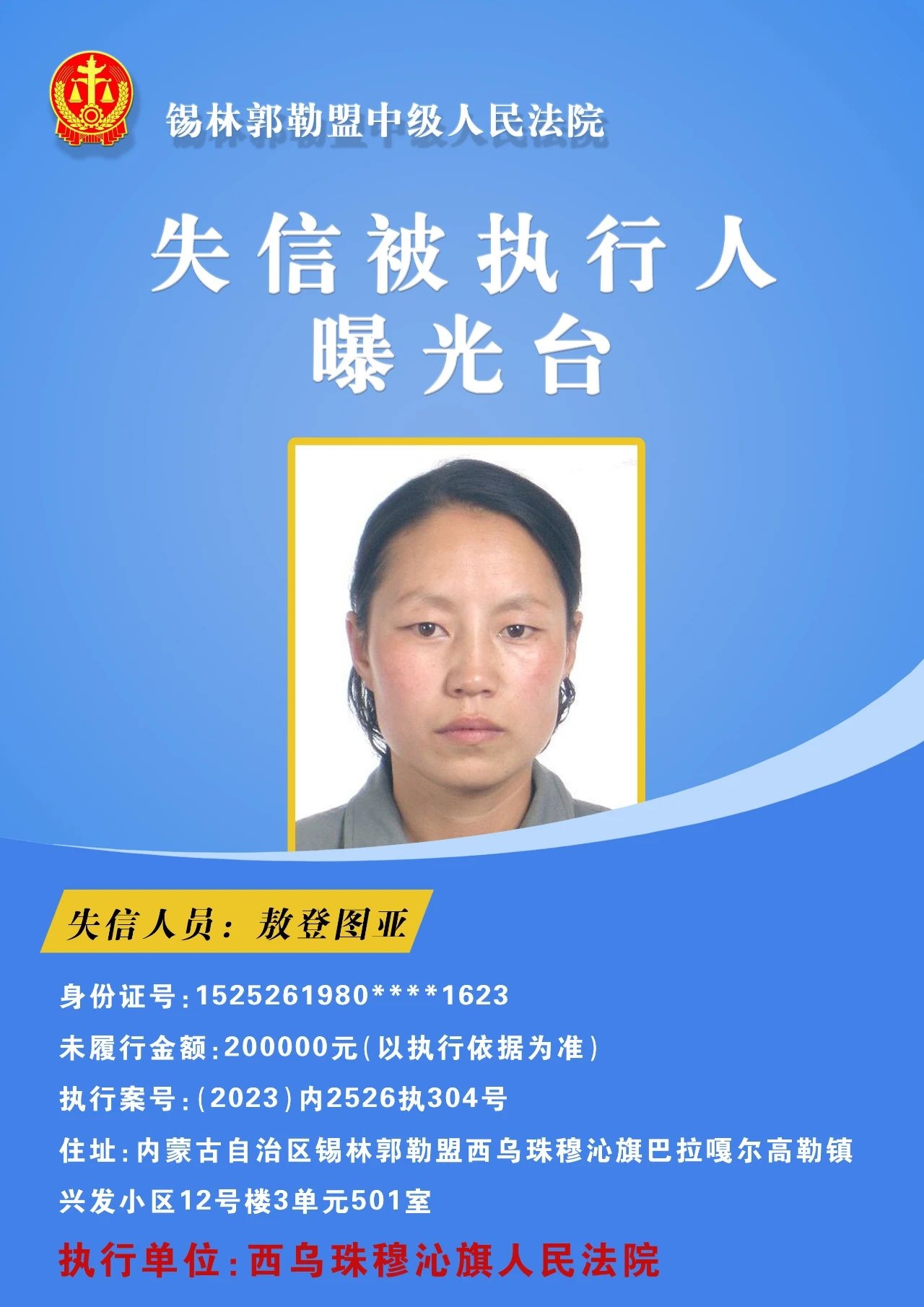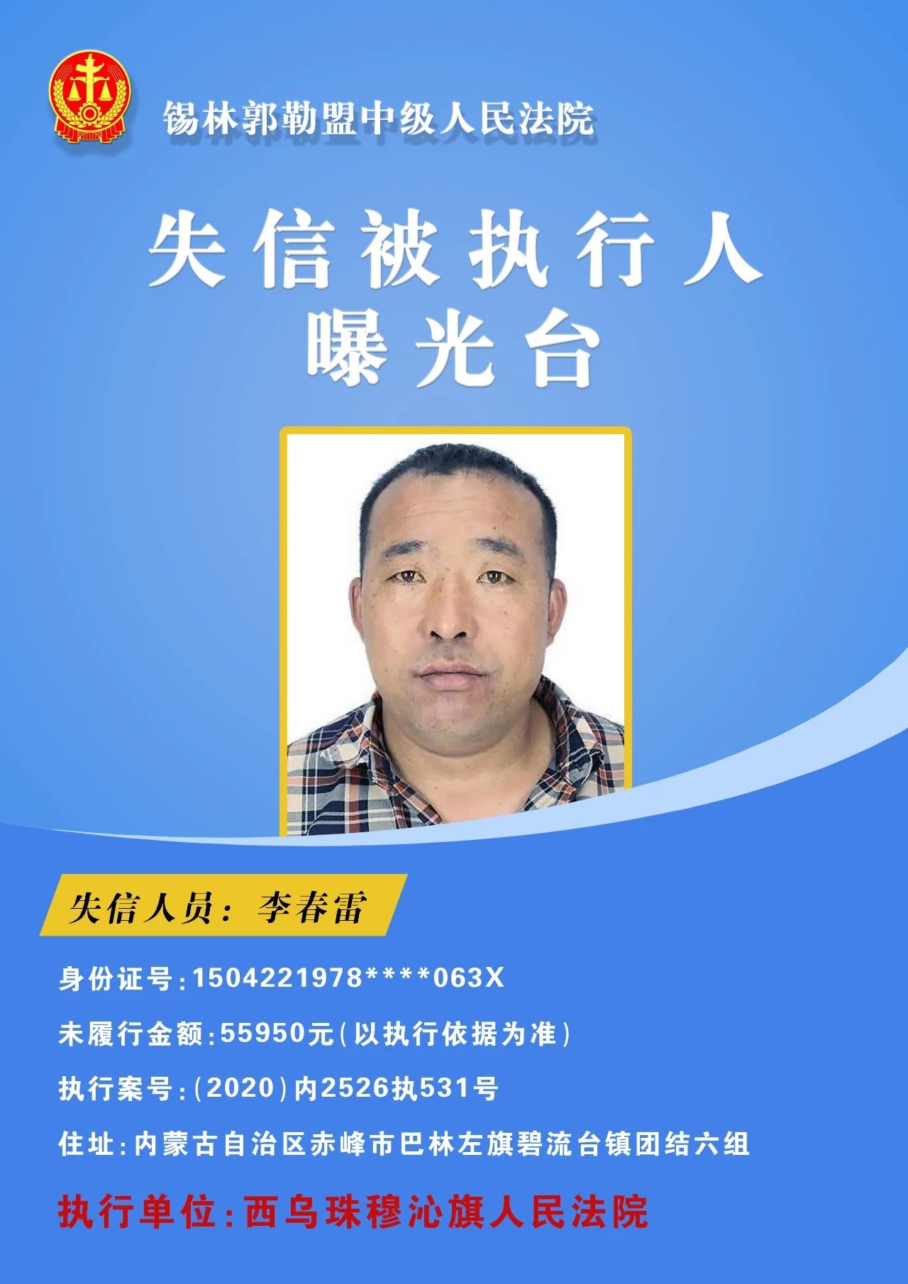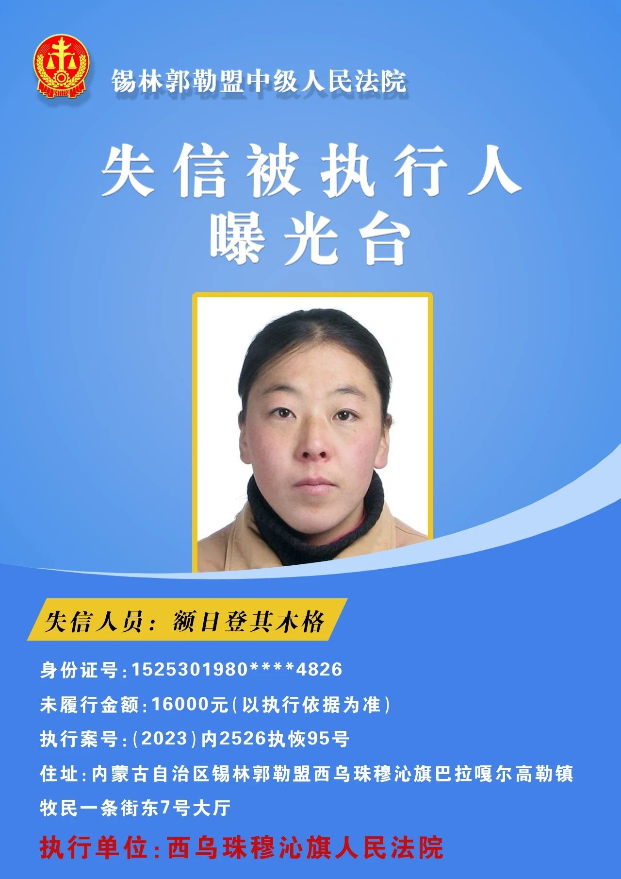 為切實保障申請執行人的合法權益,促使被執行人自覺履行生效法律文書確定的義務,推進社會信用體系建設,維護司法權威,根據 《最高人民法院關于公布失信被執行人名單信息的若干規定》的相關規定,經依法審查,現錫林郭勒盟中級人民法院將下列失信被執行人名單予以公布,希望社會各界予以監督,如有發現失信被執行人線索,請及時舉報。
