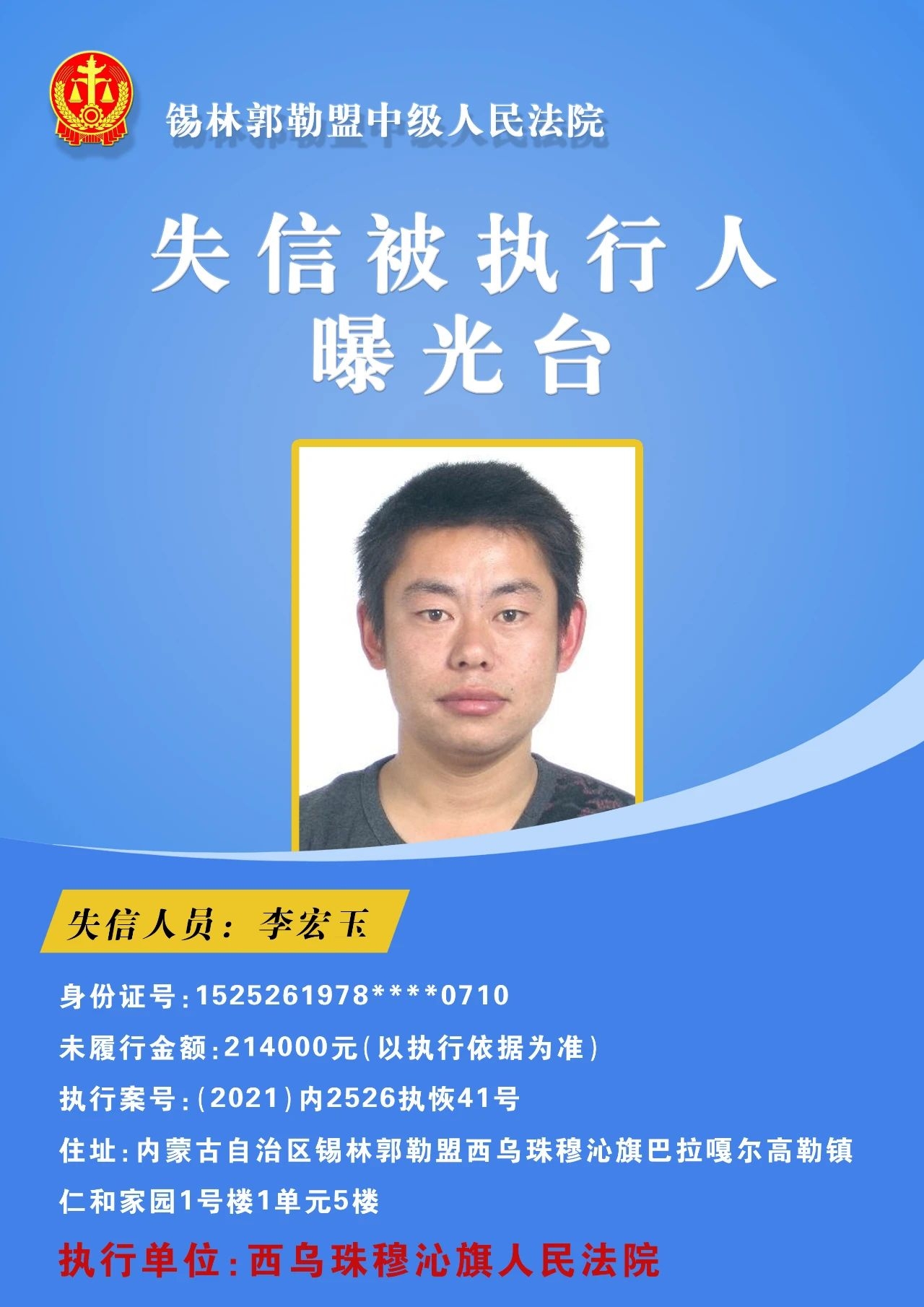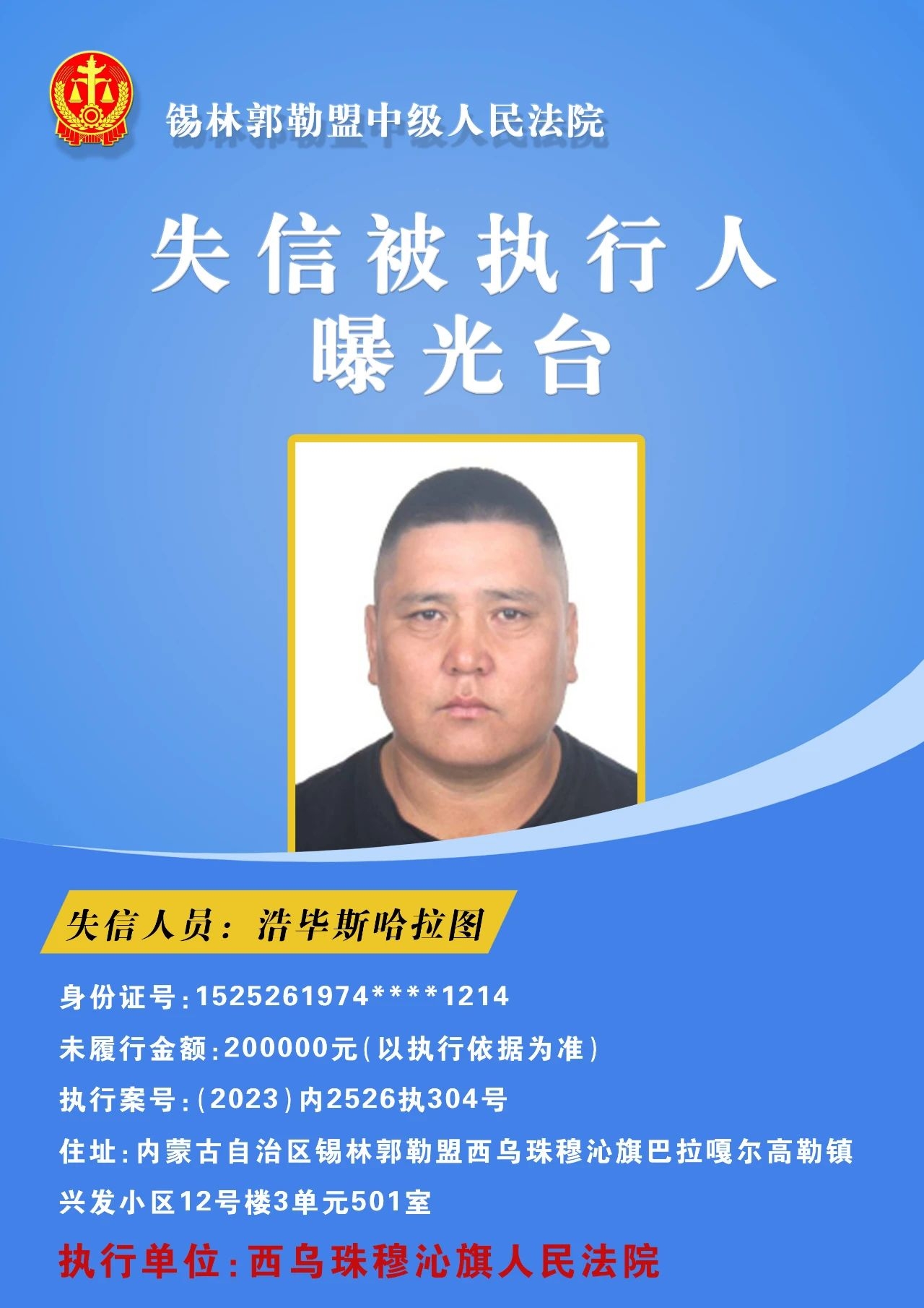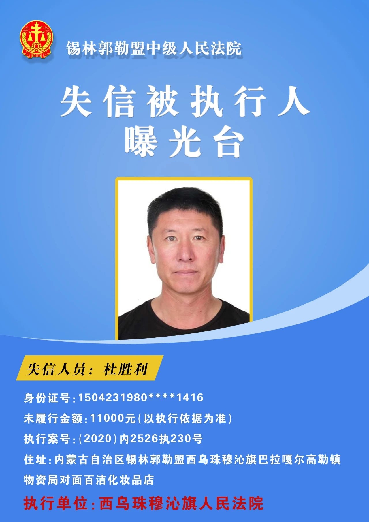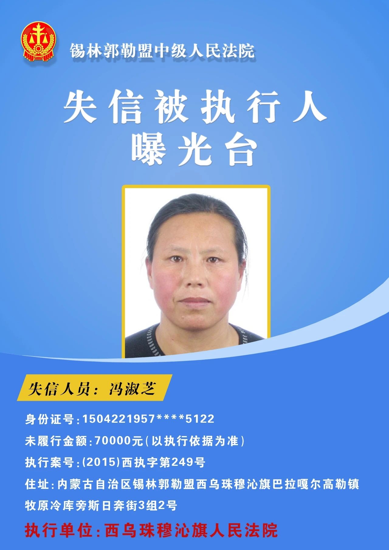 為切實保障申請執行人的合法權益,促使被執行人自覺履行生效法律文書確定的義務,推進社會信用體系建設,維護司法權威,根據 《最高人民法院關于公布失信被執行人名單信息的若干規定》的相關規定,經依法審查,現錫林郭勒盟中級人民法院將下列失信被執行人名單予以公布,希望社會各界予以監督,如有發現失信被執行人線索,請及時舉報。