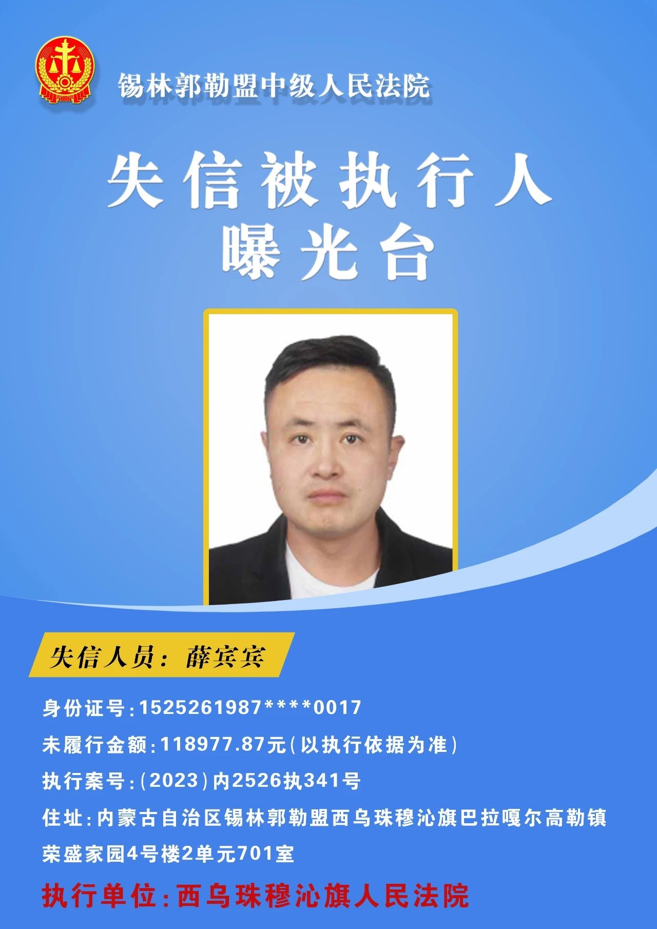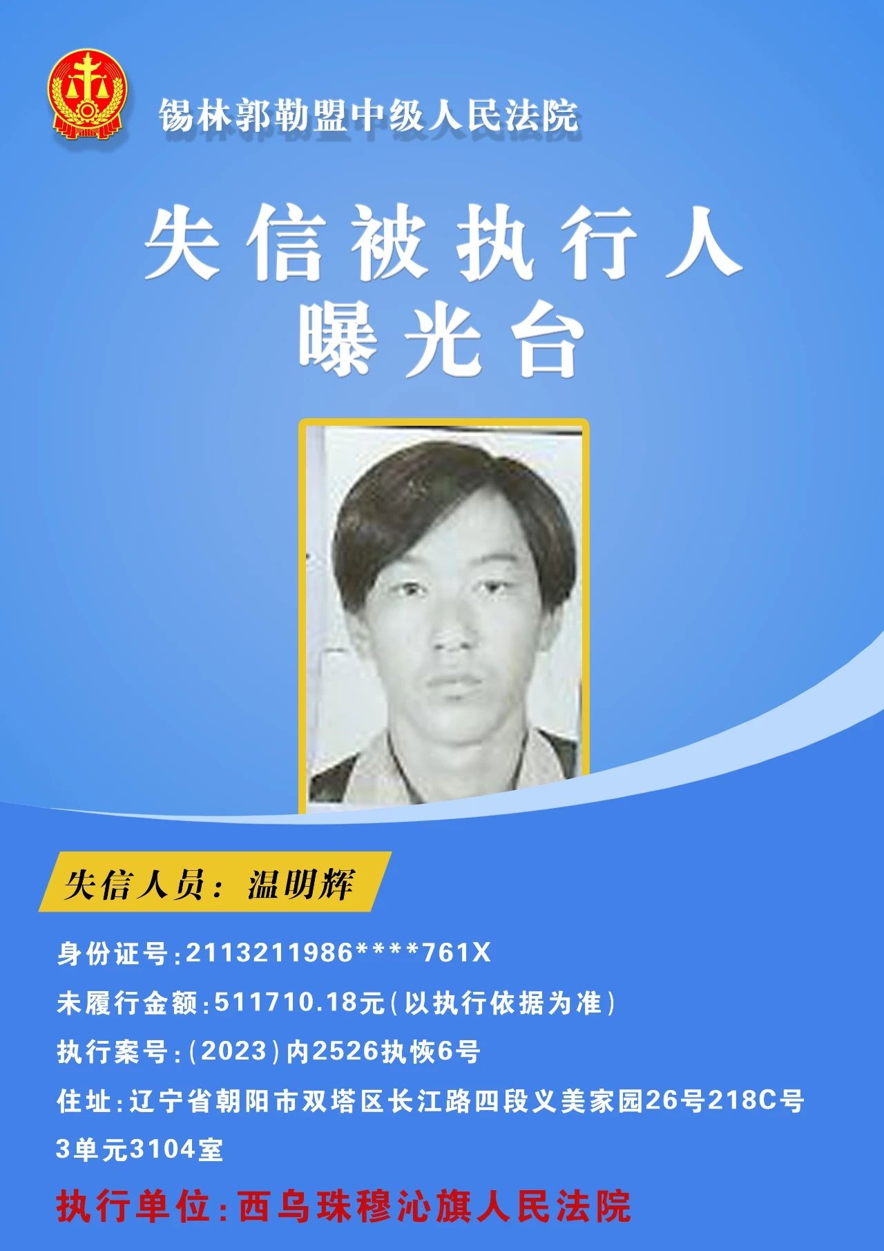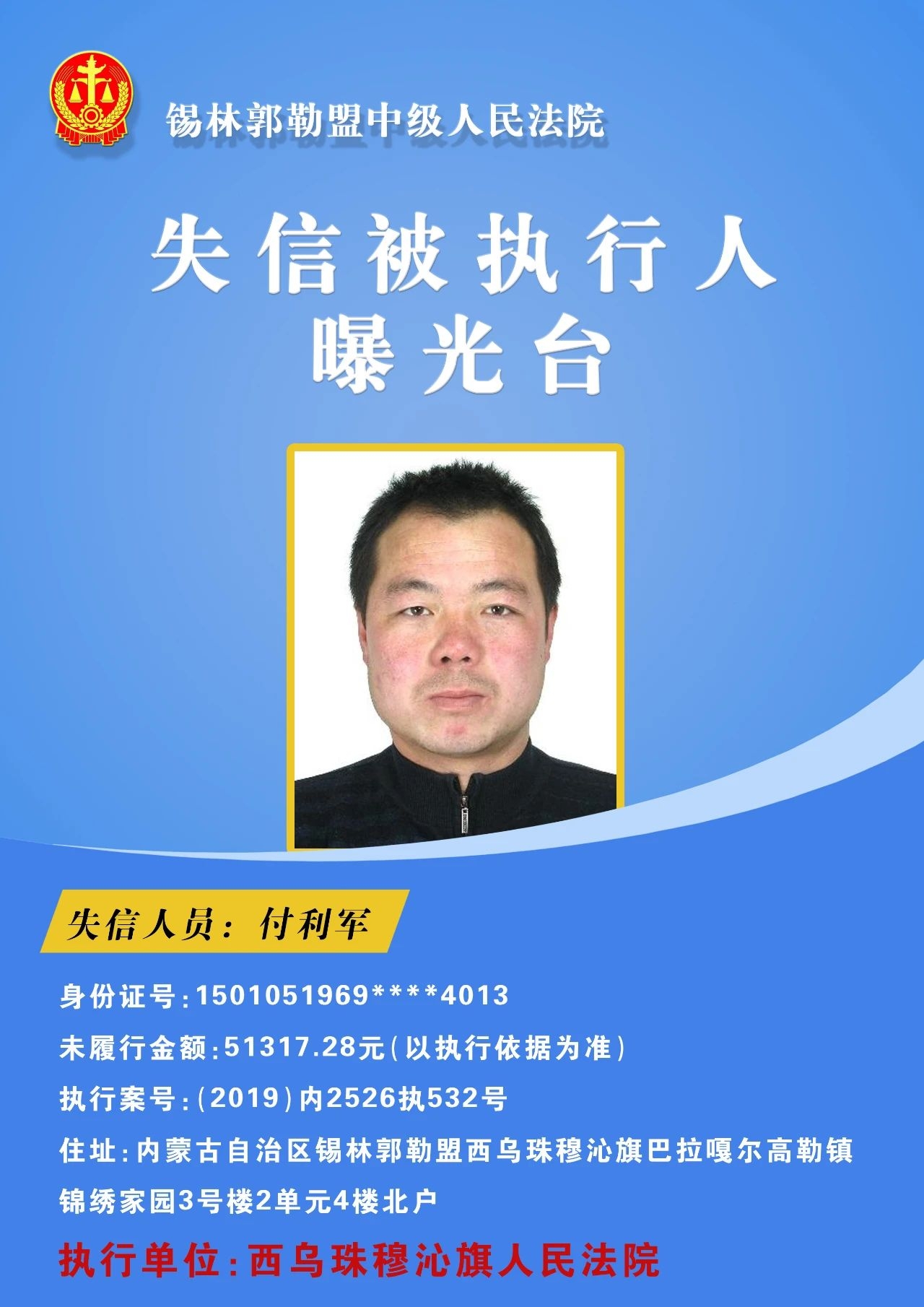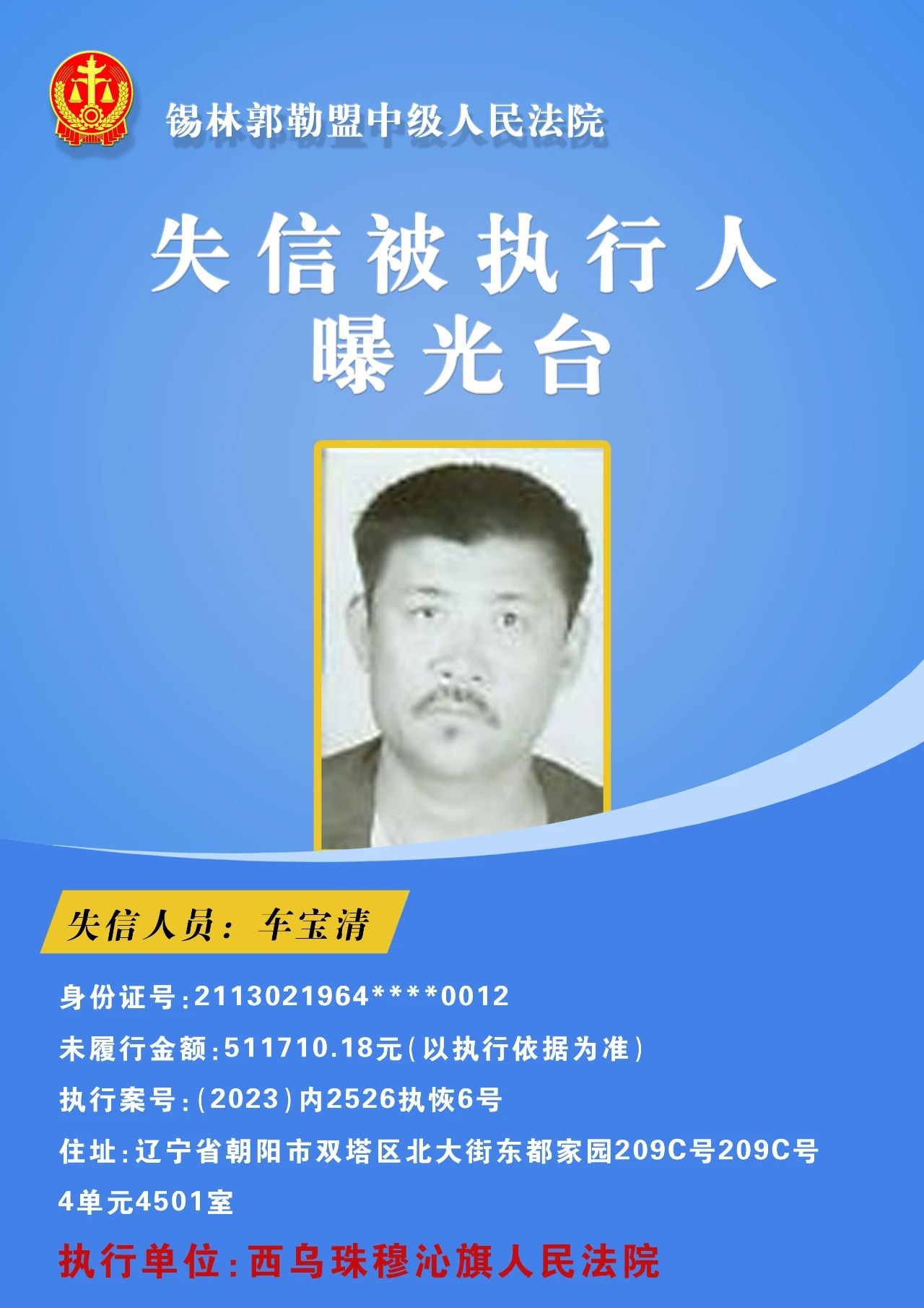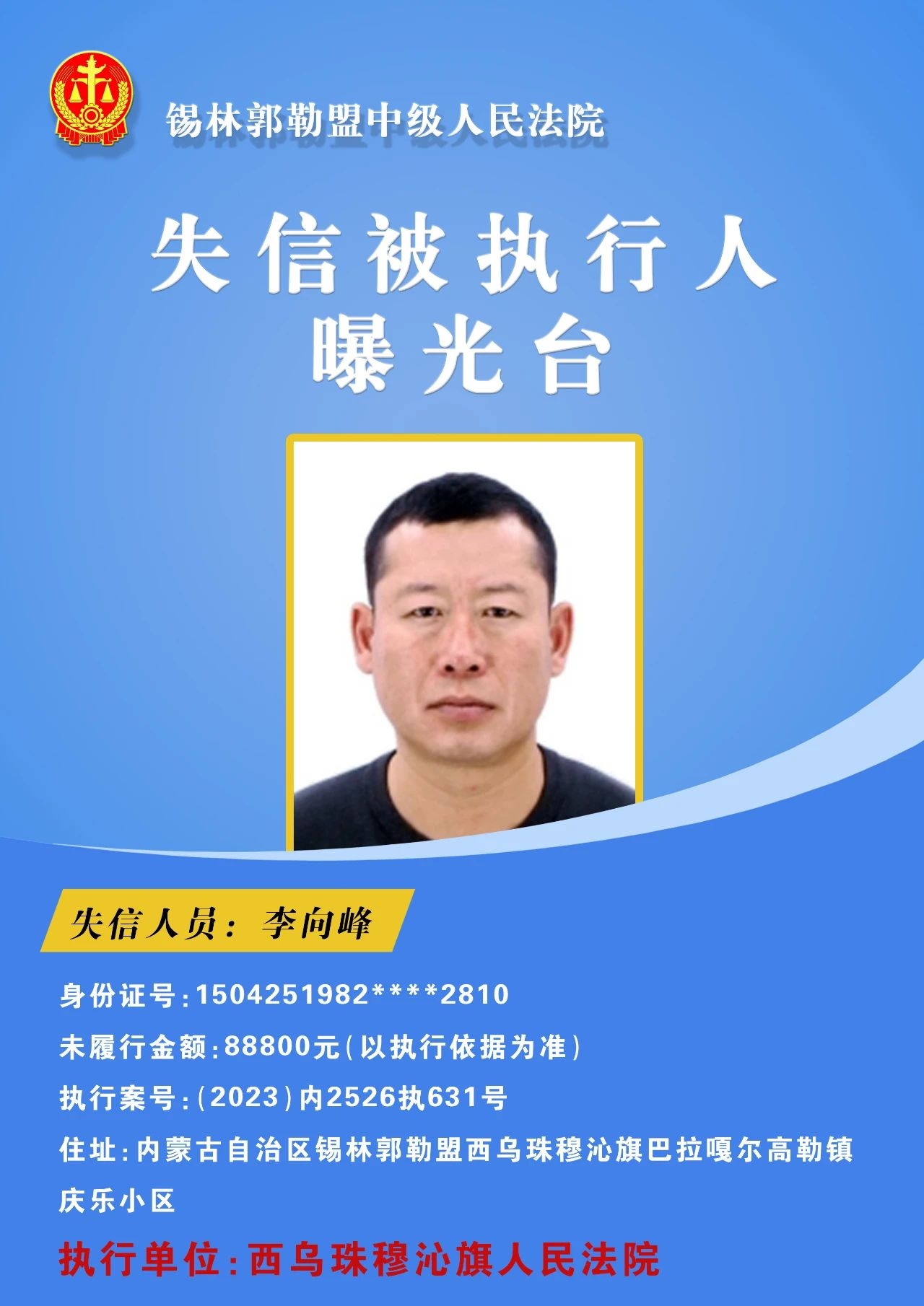 為切實保障申請執行人的合法權益,促使被執行人自覺履行生效法律文書確定的義務,推進社會信用體系建設,維護司法權威,根據 《最高人民法院關于公布失信被執行人名單信息的若干規定》的相關規定,經依法審查,現錫林郭勒盟中級人民法院將下列失信被執行人名單予以公布,希望社會各界予以監督,如有發現失信被執行人線索,請及時舉報。