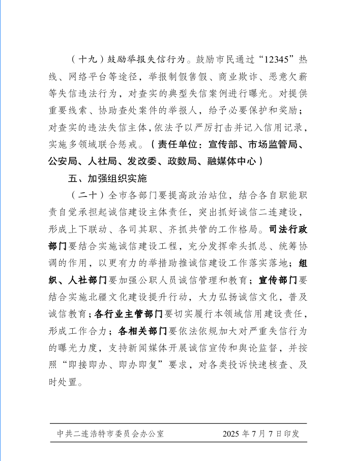 2025年7月7日,二連浩特市委員會(huì)辦公室 二連浩特市人民政府辦公室印發(fā)《二連浩特市加強(qiáng)誠信建設(shè)的實(shí)施方案》,著力構(gòu)建誠信政府、誠信社會(huì)、誠信企業(yè)、誠信市民四位一體新格局。