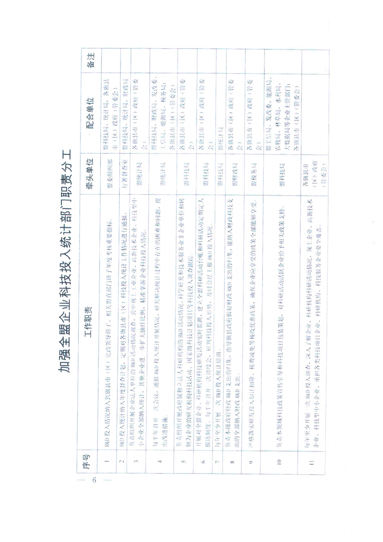 (二)強化責任落實。盟科技局、統計局按照職能職責和任務?分工,建立R&D投入統計臺賬,合理安排任務推進計劃,明確時 間節點、責任領導、責任科室。各旗縣市(區)按照方案,結合當實?際,進一步細化措施,建立企業聯絡員制度,實行網格化管理,責任到人,合力推動R&D投入統計工作全面開展。