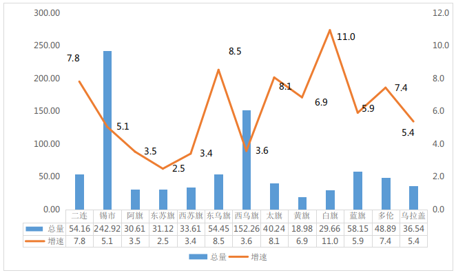 前三季度,全盟13個(gè)縣域生產(chǎn)總值呈恢復(fù)向好態(tài)勢。其中,7地區(qū)生產(chǎn)總值增速跑贏全盟,依次是白旗(11.0%)、東烏旗(8.5%)、太旗(8.1%)、二連浩特市(7.8%)、多倫縣(7.4%)、黃旗(6.9%)和藍(lán)旗(5.9%),分別高于全盟平均水平5.4、2.9、2.5、2.2、1.8、1.3和0.3個(gè)百分點(diǎn);6地區(qū)增速低于全盟平均水平,依次為烏拉蓋(5.4%)、錫林浩特市(5.1%)、西烏旗(3.6%)、阿旗(3.5%)、西蘇旗(3.4%)和東蘇旗(2.5%),分別低于全盟平均水平0.2、0.5、2.0、2.1、2.2和3.1個(gè)百分點(diǎn)。