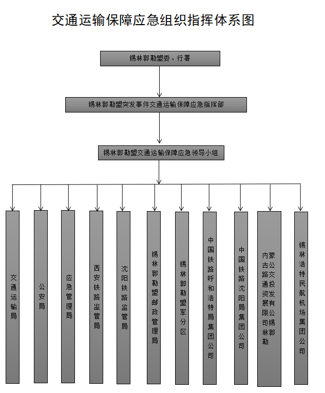 錫林郭勒盟行署成立錫林郭勒盟突發事件交通運輸保障應急指揮部,各旗縣市(區)人民政府(管委會)設立交通運輸保障應急指揮機構,負責本行政區的突發事件交通運輸保障應急工作。公路、鐵路、民航、郵政等相關部門和單位,根據需要設立交通運輸保障應急機構,負責本領域、本單位的交通運輸保障應急工作。