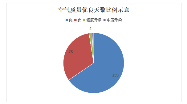 1-8月空氣質量優天數:159天、良天數:78天、輕度污染天數4天、中度污染天數2天。空氣質量優良天數比例97.5%。