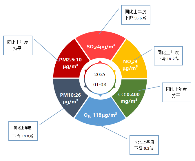 與上年同期相比,SO2濃度平均值下降55.6%、NO2濃度平均值下降18.2%、PM10濃度平均值下降18.8%、CO濃度平均值持平、O3濃度平均值下降9.2%,PM2.5濃度平均值持平,空氣質量優良率上升2.0%。
