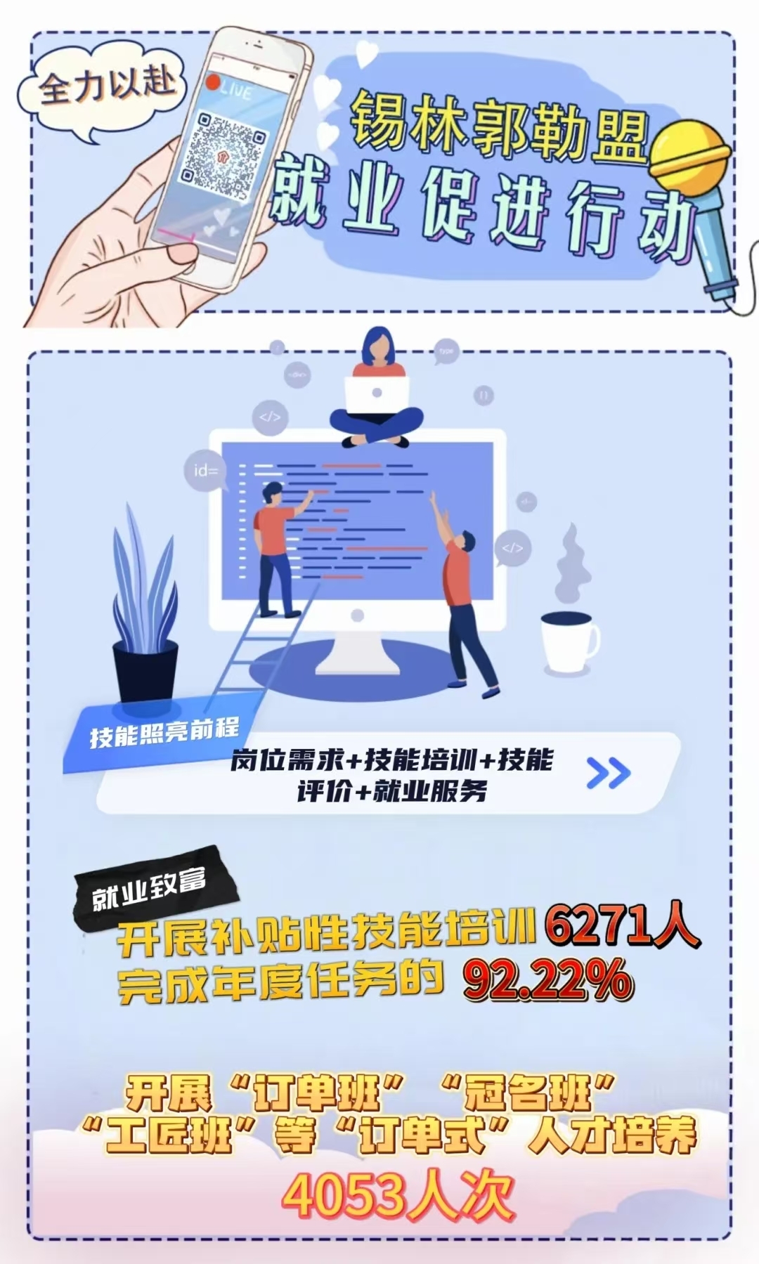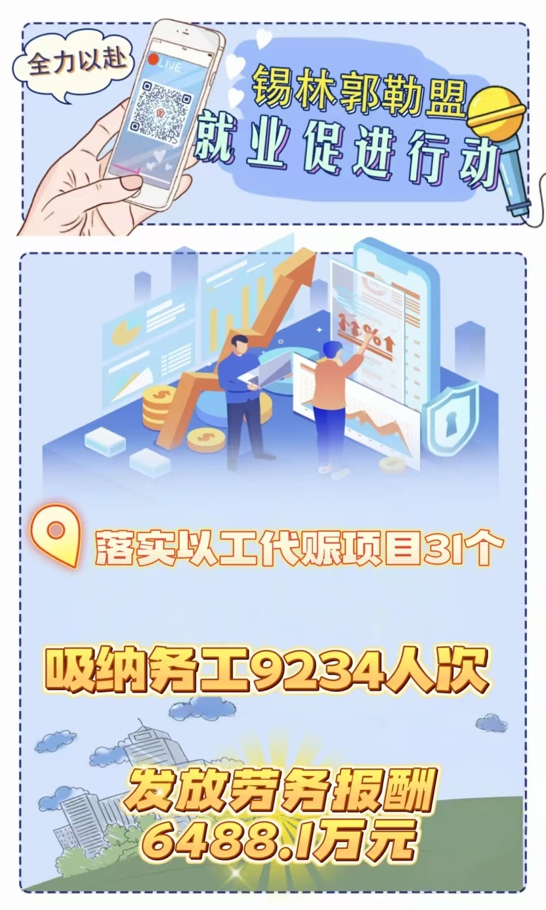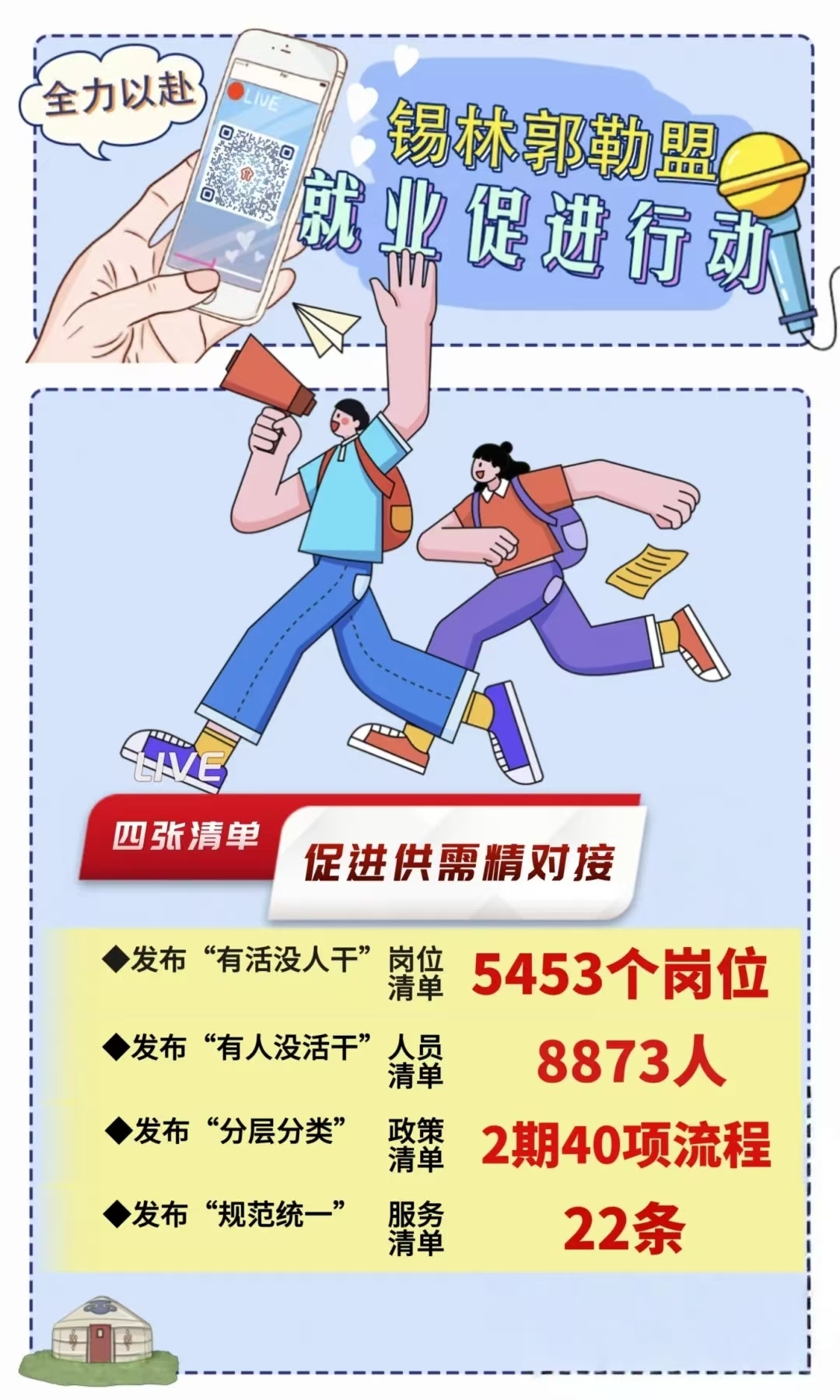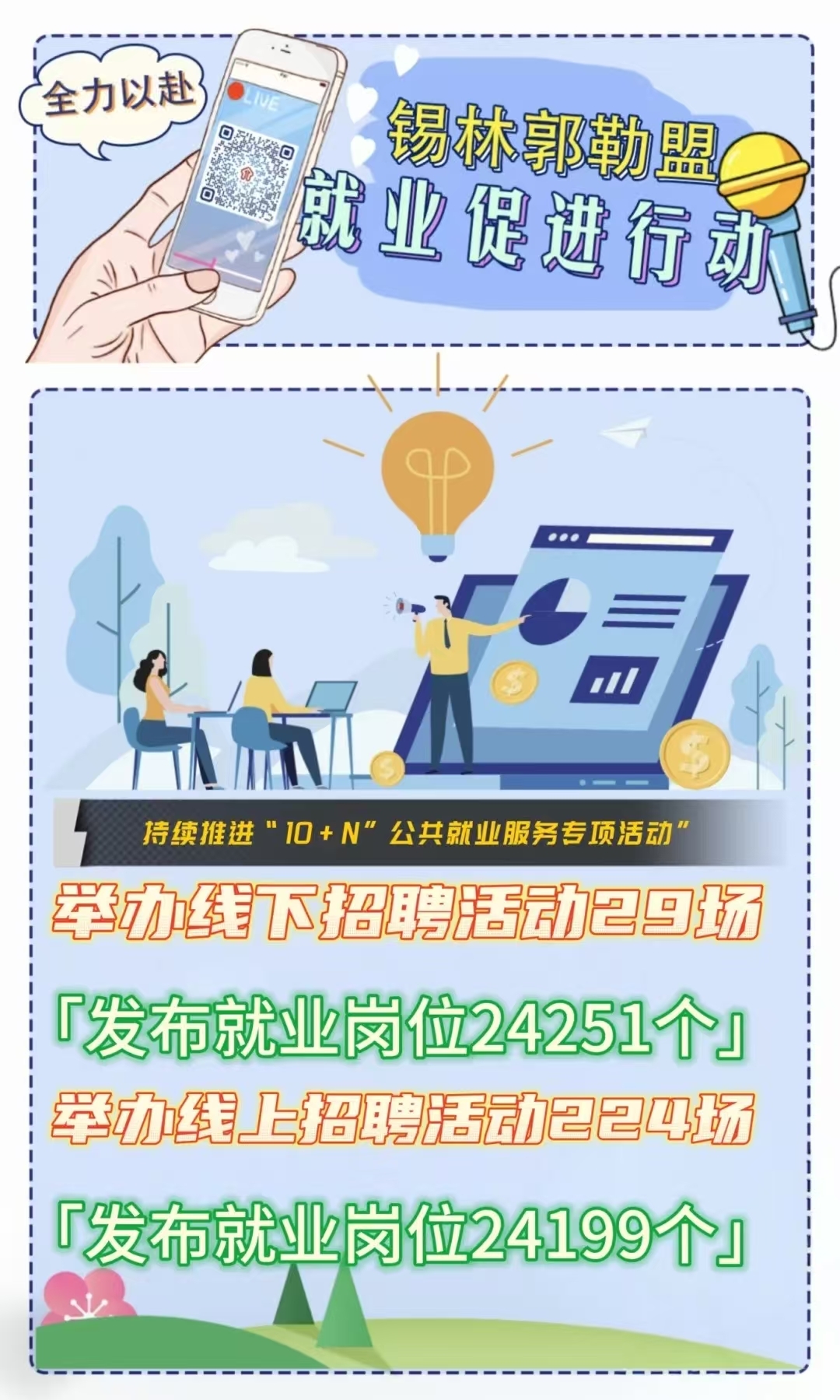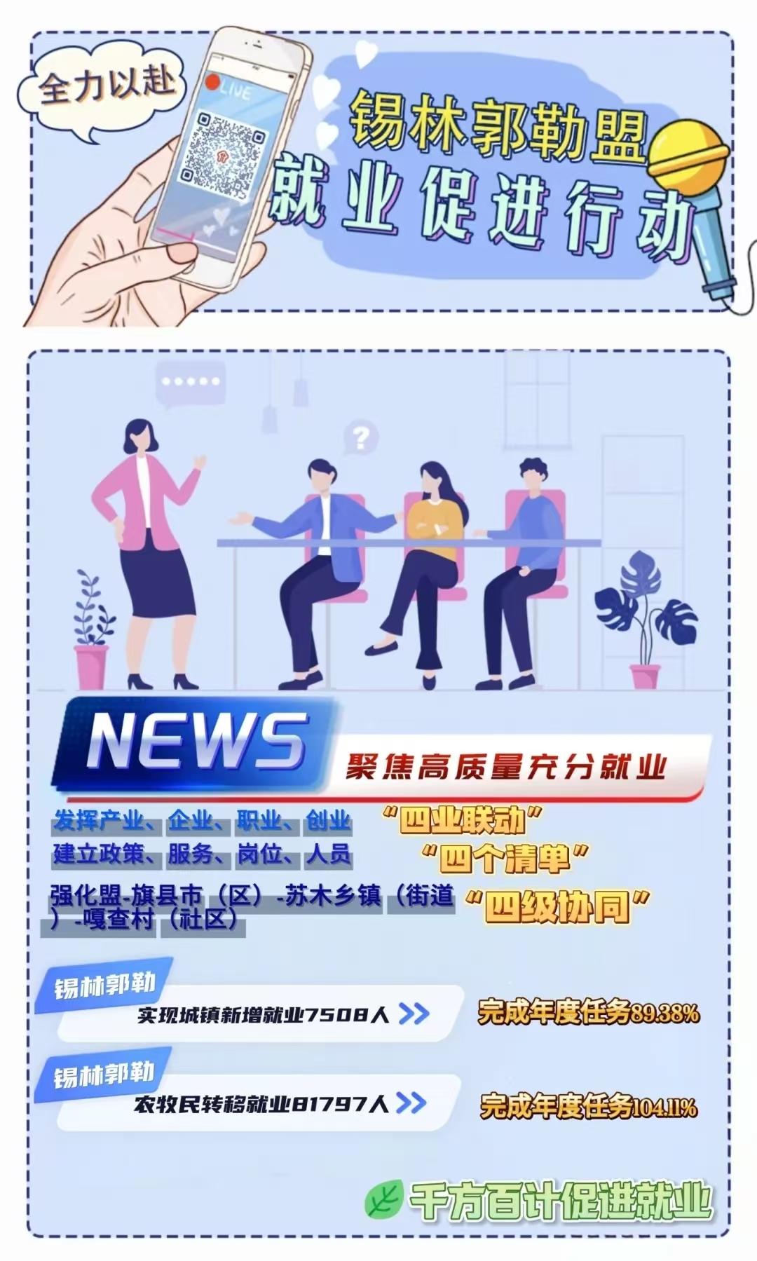 今年以來,錫林郭勒盟人社局聚焦自治區辦好“兩件大事”、實施“六個工程”、開展“六個行動”,以落實就業促進行動為牽引,加強政策研究、強化統籌調度、細化工作舉措,精心部署任務表、合力繪制路線圖,全力以赴構建起組織體系縱向貫通、部門合力橫向聯動、全域全鏈融合協調的運行機制,人社部門牽頭抓總推動部門間統籌協作,各成員單位發揮行業部門主體作用履職盡責,全社會廣泛關注的高質量充分就業格局基本形成,各項工作有力有序推進落實,主要指標實現“時間過半、完成過半”,部分指標提前完成年度任務,各項指標走在全區前列。