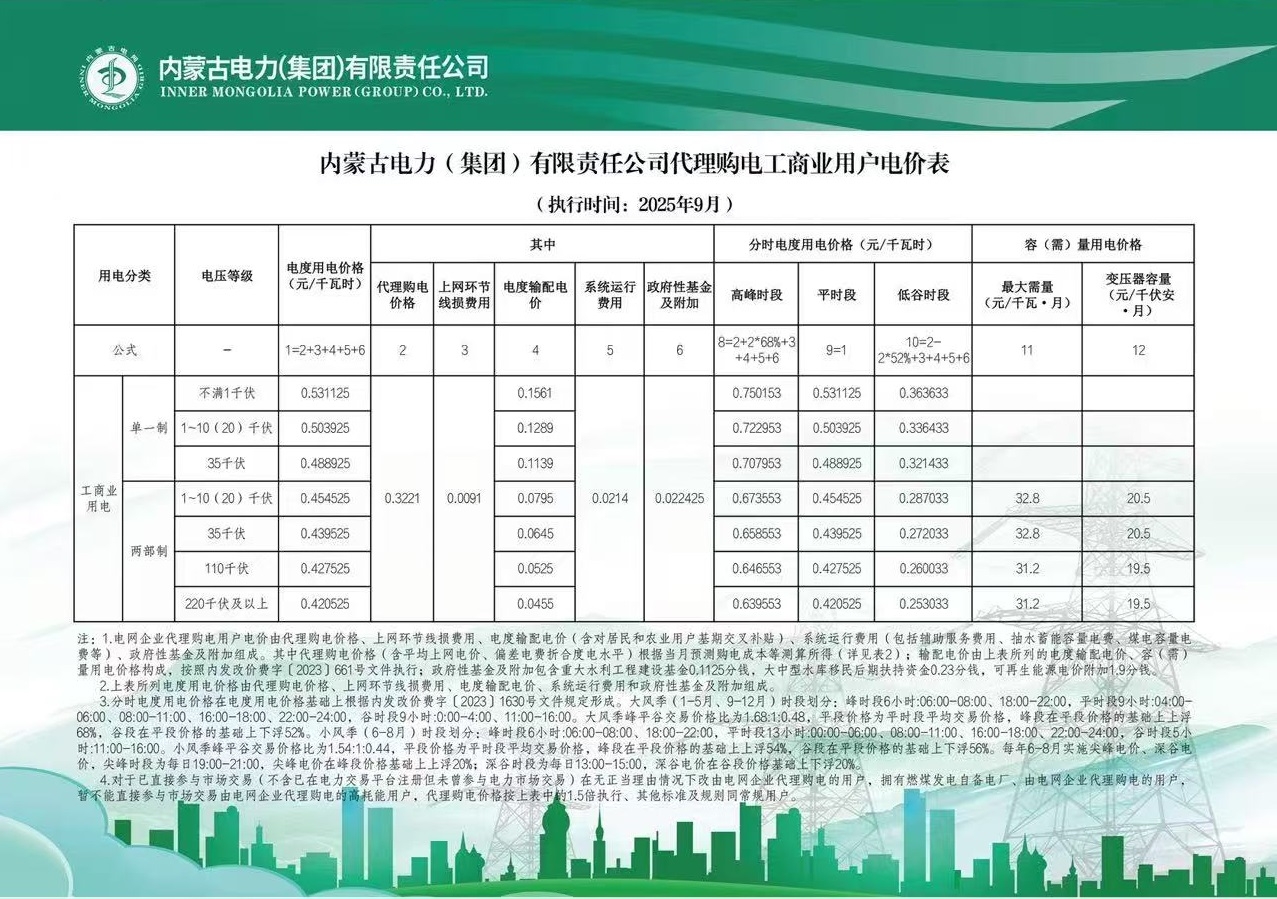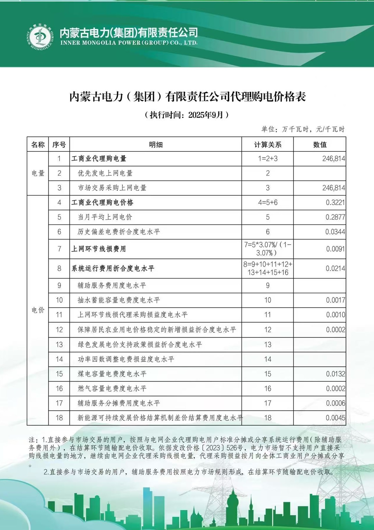 按照《國家發展改革委關于進一步深化燃煤發電上網電價市場化改革的通知》(發改價格〔2021〕1439號)、《國家發展改革委辦公廳關于組織開展電網企業代理購電工作有關事項的通知》(發改辦價格〔2021〕809號)、《國家發展改革委關于第三監管周期省級電網輸配電價及有關事項的通知》(發改價格〔2023〕526號)、《關于內蒙古電力市場綠色電力交易試點方案的復函》(發改辦體改〔2024〕82號)文件要求,我公司已完成代理工商業客戶2025年9月市場化新能源(綠電)采購工作和代購電價測算,綠色電力環境價值0.0282元/千瓦時,9月份代理購電客戶實際新能源(綠電)結算電量以電費結算單結果為準。因供需緊張出現電力缺口的時段我公司將通過省間現貨交易方式補充代理購電電量,由此產生的代理購電價格變動按照現行市場交易規則進行結算。現將內蒙古電力(集團)有限責任公司代理購電工商業用戶電價表予以公布。